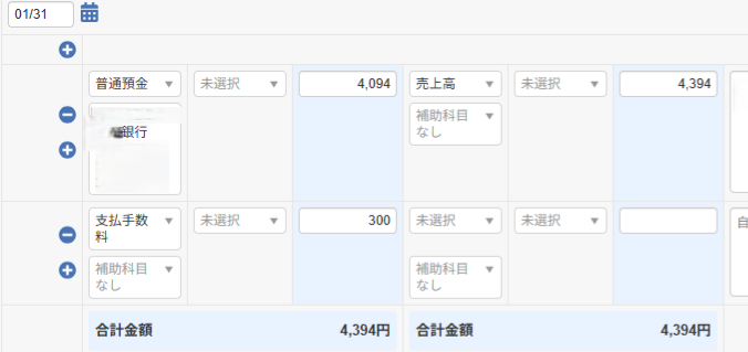 撮影: 銀行連携で自動取得された明細を「支払手数料」と「売上」にした後の画面。
